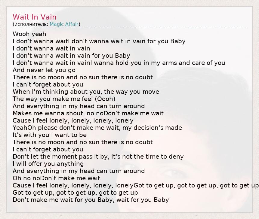 Wooh yeah I don't wanna waitI don't wanna wait in vain for you Baby I don't wanna wait in vain I don't wanna wait in vain for you Baby I don't wanna wait in vainI wanna hold you in my arms and care of you And never let you go There is no moon and no sun there is no doubt I can't forget about you When I'm thinking about you, the way you move The way you make me feel (Oooh) And everything in my head can turn around Makes me wanna shout, no noDon't make me wait Cause I feel lonely, lonely, lonely, lonely YeahOh please don't make me wait, my decision's made It's with you I want to be There is no moon and no sun there is no doubt I can't forget about you Don't let the moment pass it by, it's not the time to deny I will offer you anything And everything in my head can turn around Oh no noDon't make me wait Cause I feel lonely, lonely, lonely, lonelyGot to get up, got to get up, got to get up Got to get up, got to get up, got to get up Don't make me wait for you Baby, wait for you Baby