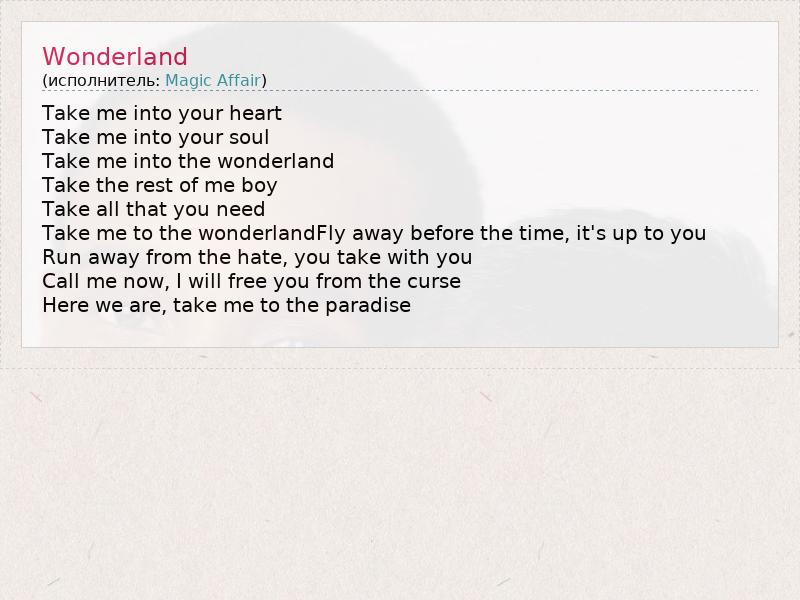 Take me into your heart Take me into your soul Take me into the wonderland Take the rest of me boy Take all that you need Take me to the wonderlandFly away before the time, it's up to you Run away from the hate, you take with you Call me now, I will free you from the curse Here we are, take me to the paradise