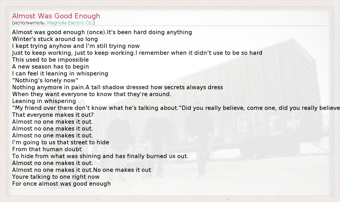 Almost was good enough (once).It's been hard doing anything Winter's stuck around so long I kept trying anyhow and I'm still trying now Just to keep working, just to keep working.I remember when it didn't use to be so hard This used to be impossible A new season has to begin I can feel it leaning in whispering "Nothing's lonely now" Nothing anymore in pain.A tall shadow dressed how secrets always dress When they want everyone to know that they're around. Leaning in whispering "My friend over there don't know what he's talking about."Did you really believe, come one, did you really believe That everyone makes it out? Almost no one makes it out. Almost no one makes it out. Almost no one makes it out. I'm going to us that street to hide From that human doubt To hide from what was shining and has finally burned us out. Almost no one makes it out. Almost no one makes it out.No one makes it out Youre talking to one right now For once almost was good enough