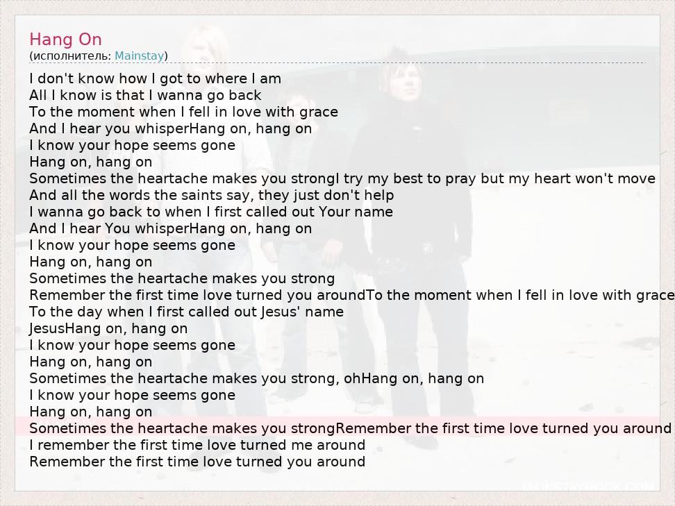 I don't know how I got to where I am All I know is that I wanna go back To the moment when I fell in love with grace And I hear you whisperHang on, hang on I know your hope seems gone Hang on, hang on Sometimes the heartache makes you strongI try my best to pray but my heart won't move And all the words the saints say, they just don't help I wanna go back to when I first called out Your name And I hear You whisperHang on, hang on I know your hope seems gone Hang on, hang on Sometimes the heartache makes you strong Remember the first time love turned you aroundTo the moment when I fell in love with grace To the day when I first called out Jesus' name JesusHang on, hang on I know your hope seems gone Hang on, hang on Sometimes the heartache makes you strong, ohHang on, hang on I know your hope seems gone Hang on, hang on Sometimes the heartache makes you strongRemember the first time love turned you around I remember the first time love turned me around Remember the first time love turned you around