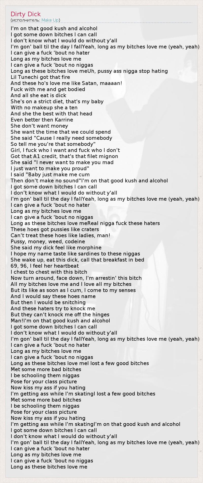 I'm on that good kush and alcohol I got some down bitches I can call I don't know what I would do without y'all I'm gon' ball til the day I fallYeah, long as my bitches love me (yeah, yeah) I can give a fuck 'bout no hater Long as my bitches love me I can give a fuck 'bout no niggas Long as these bitches love meUh, pussy ass nigga stop hating Lil Tunechi got that fire And these ho's love me like Satan, maaaan! Fuck with me and get bodied And all she eat is dick She's on a strict diet, that's my baby With no makeup she a ten And she the best with that head Even better then Karrine She don't want money She want the time that we could spend She said "Cause I really need somebody So tell me you're that somebody" Girl, I fuck who I want and fuck who I don't Got that A1 credit, that's that filet mignon She said "I never want to make you mad I just want to make you proud" I said "Baby just make me cum Then don't make no sound"I'm on that good kush and alcohol I got some down bitches I can call I don't know what I would do without y'all I'm gon' ball til the day I fallYeah, long as my bitches love me (yeah, yeah) I can give a fuck 'bout no hater Long as my bitches love me I can give a fuck 'bout no niggas Long as these bitches love meReal nigga fuck these haters These hoes got pussies like craters Can't treat these hoes like ladies, man! Pussy, money, weed, codeine She said my dick feel like morphine I hope my name taste like sardines to these niggas She wake up, eat this dick, call that breakfast in bed 69, 96, I feel her heartbeat I chest to chest with this bitch Now turn around, face down, I'm arrestin' this bitch All my bitches love me and I love all my bitches But its like as soon as I cum, I come to my senses And I would say these hoes name But then I would be snitching And these haters try to knock me But they can't knock me off the hinges Man!I'm on that good kush and alcohol I got some down bitches I can call I don't know what I would do without y'all I'm gon' ball til the day I fallYeah, long as my bitches love me (yeah, yeah) I can give a fuck 'bout no hater Long as my bitches love me I can give a fuck 'bout no niggas Long as these bitches love meI lost a few good bitches Met some more bad bitches I be schooling them niggas Pose for your class picture Now kiss my ass if you hating I'm getting ass while I'm skatingI lost a few good bitches Met some more bad bitches I be schooling them niggas Pose for your class picture Now kiss my ass if you hating I'm getting ass while I'm skatingI'm on that good kush and alcohol I got some down bitches I can call I don't know what I would do without y'all I'm gon' ball til the day I fallYeah, long as my bitches love me (yeah, yeah) I can give a fuck 'bout no hater Long as my bitches love me I can give a fuck 'bout no niggas Long as these bitches love me