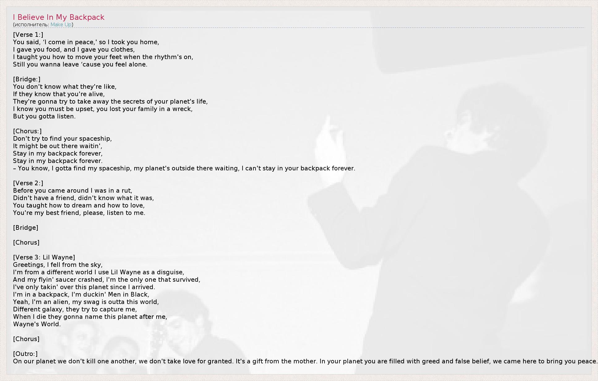 [Куплет 1:] Ты сказала: "Я пришла с миром", – поэтому я забрал тебя домой, Дал тебе пищу и одежду, Научил тебя приплясывать под ритм, Но ты всё ещё хочешь уйти, потому что тебе одиноко. [Переход:] Ты не знаешь, какие они, Понимают ли они, что ты жива, Они попробуют выведать секреты о жизни на твоей планете, Я знаю: тебе, должно быть, грустно, ведь ты потеряла всю семью при крушении, Но послушай... [Припев:] Не пытайся найти свой корабль, Он, наверное, ждёт поблизости, Оставайся в моём рюкзаке навечно, Оставайся в моём рюкзаке навечно. – Понимаешь, я должна найти свой корабль, моя планета ждёт, я не могу вечно оставаться в твоём рюкзаке. [Куплет 2:] Пока не появилась ты, я не выбивался из колеи, У меня не было друзей, я даже не знал, что это такое, Ты научила меня мечтать и любить, Ты мой лучший друг, пожалуйста, послушай меня. [Переход] [Припев] [Куплет 3: Lil Wayne] Приветствую! Я свалился с неба, Я из другого мира, а Лил Уэйн – моё прикрытие. В аварии летающей тарелки выжил я один И захватил эту планету, едва высадившись. В рюкзаке я прячусь от Людей в Чёрном, Да, я пришелец, моя крутизна из запредельного мира, Другая галактика пытается взять меня в плен, Когда я умру, эту планету назовут в мою честь – Мир Уэйна. [Припев] [Заключение:] На нашей планете мы не убиваем друг друга, не воспринимаем любовь как должное: это дар от матери. На вашей планете вы полны жадности и ложных убеждений, мы пришли, чтобы дать вам мир.