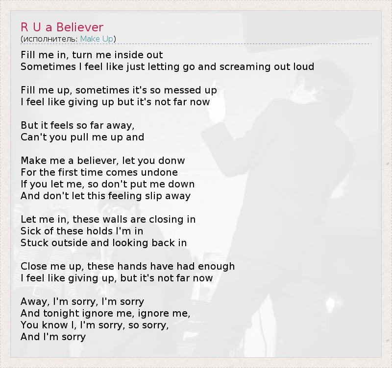 Fill me in, turn me inside out Sometimes I feel like just letting go and screaming out loud Fill me up, sometimes it's so messed up I feel like giving up but it's not far now But it feels so far away, Can't you pull me up and Make me a believer, let you donw For the first time comes undone If you let me, so don't put me down And don't let this feeling slip away Let me in, these walls are closing in Sick of these holds I'm in Stuck outside and looking back in Close me up, these hands have had enough I feel like giving up, but it's not far now Away, I'm sorry, I'm sorry And tonight ignore me, ignore me, You know I, I'm sorry, so sorry, And I'm sorry