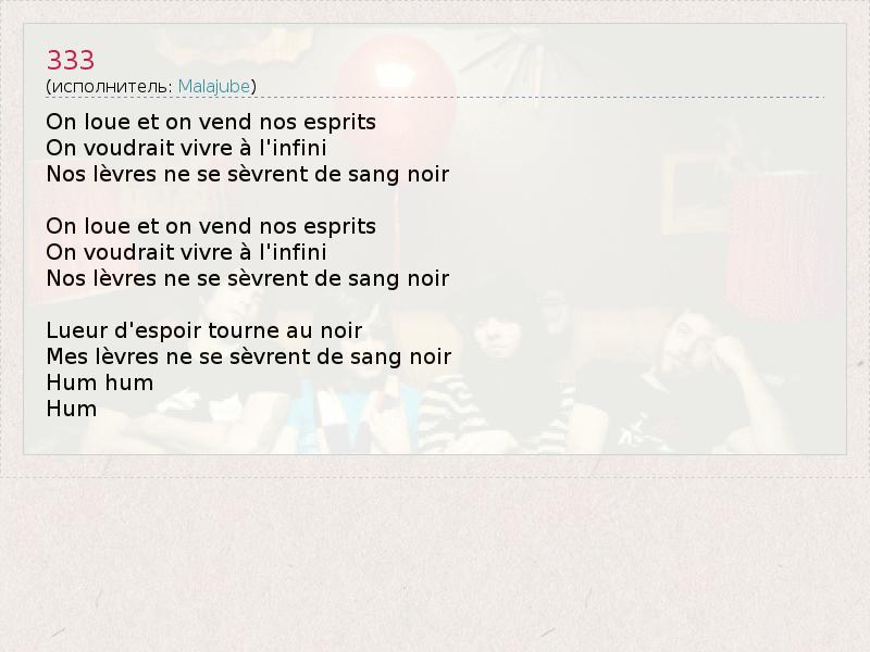 On loue et on vend nos esprits On voudrait vivre à l'infini Nos lèvres ne se sèvrent de sang noir On loue et on vend nos esprits On voudrait vivre à l'infini Nos lèvres ne se sèvrent de sang noir Lueur d'espoir tourne au noir Mes lèvres ne se sèvrent de sang noir Hum hum Hum