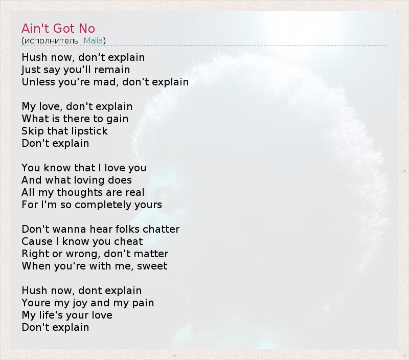 Hush now, don't explain Just say you'll remain Unless you're mad, don't explain My love, don't explain What is there to gain Skip that lipstick Don't explain You know that I love you And what loving does All my thoughts are real For I'm so completely yours Don't wanna hear folks chatter Cause I know you cheat Right or wrong, don't matter When you're with me, sweet Hush now, dont explain Youre my joy and my pain My life's your love Don't explain