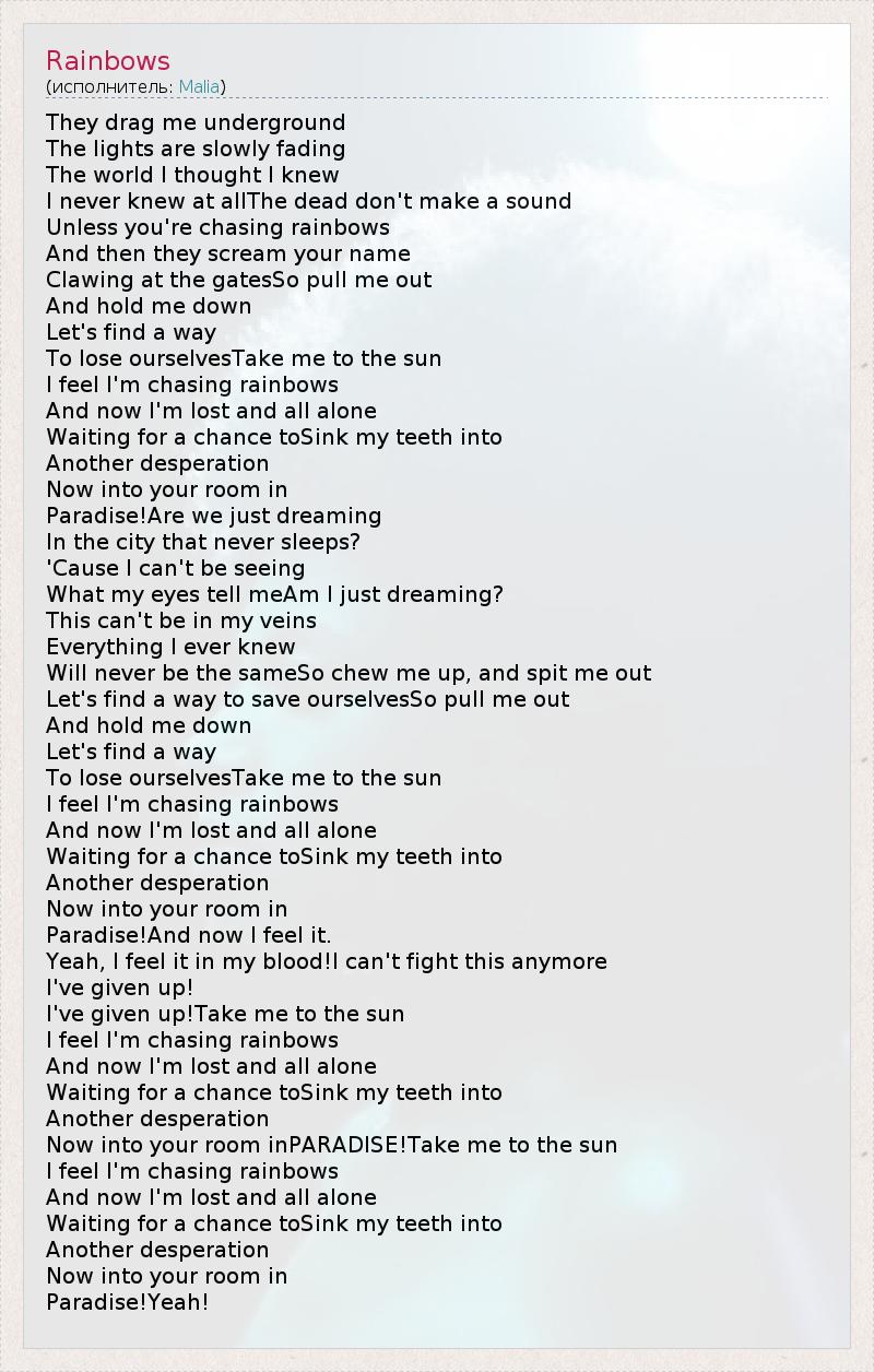 They drag me underground The lights are slowly fading The world I thought I knew I never knew at allThe dead don't make a sound Unless you're chasing rainbows And then they scream your name Clawing at the gatesSo pull me out And hold me down Let's find a way To lose ourselvesTake me to the sun I feel I'm chasing rainbows And now I'm lost and all alone Waiting for a chance toSink my teeth into Another desperation Now into your room in Paradise!Are we just dreaming In the city that never sleeps? 'Cause I can't be seeing What my eyes tell meAm I just dreaming? This can't be in my veins Everything I ever knew Will never be the sameSo chew me up, and spit me out Let's find a way to save ourselvesSo pull me out And hold me down Let's find a way To lose ourselvesTake me to the sun I feel I'm chasing rainbows And now I'm lost and all alone Waiting for a chance toSink my teeth into Another desperation Now into your room in Paradise!And now I feel it. Yeah, I feel it in my blood!I can't fight this anymore I've given up! I've given up!Take me to the sun I feel I'm chasing rainbows And now I'm lost and all alone Waiting for a chance toSink my teeth into Another desperation Now into your room inPARADISE!Take me to the sun I feel I'm chasing rainbows And now I'm lost and all alone Waiting for a chance toSink my teeth into Another desperation Now into your room in Paradise!Yeah!