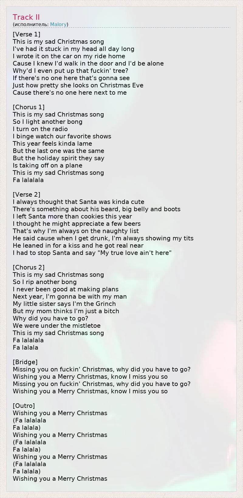 [Verse 1] This is my sad Christmas song I've had it stuck in my head all day long I wrote it on the car on my ride home Cause I knew I'd walk in the door and I'd be alone Why'd I even put up that fuckin' tree? If there's no one here that's gonna see Just how pretty she looks on Christmas Eve Cause there's no one here next to me [Chorus 1] This is my sad Christmas song So I light another bong I turn on the radio I binge watch our favorite shows This year feels kinda lame But the last one was the same But the holiday spirit they say Is taking off on a plane This is my sad Christmas song Fa lalalala [Verse 2] I always thought that Santa was kinda cute There's something about his beard, big belly and boots I left Santa more than cookies this year I thought he might appreciate a few beers That's why I'm always on the naughty list He said cause when I get drunk, I'm always showing my tits He leaned in for a kiss and he got real near I had to stop Santa and say "My true love ain't here" [Chorus 2] This is my sad Christmas song So I rip another bong I never been good at making plans Next year, I'm gonna be with my man My little sister says I'm the Grinch But my mom thinks I'm just a bitch Why did you have to go? We were under the mistletoe This is my sad Christmas song Fa lalalala Fa lalala [Bridge] Missing you on fuckin' Christmas, why did you have to go? Wishing you a Merry Christmas, know I miss you so Missing you on fuckin' Christmas, why did you have to go? Wishing you a Merry Christmas, know I miss you so [Outro] Wishing you a Merry Christmas (Fa lalalala Fa lalala) Wishing you a Merry Christmas (Fa lalalala Fa lalala) Wishing you a Merry Christmas (Fa lalalala Fa lalala) Wishing you a Merry Christmas