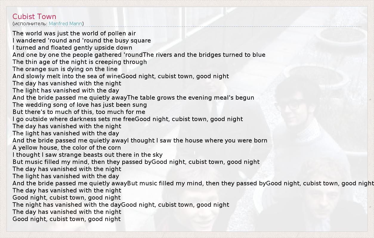 And the bride passed me quietly awayBut music filled my mind, then they passed byGood night, cubist town, good night