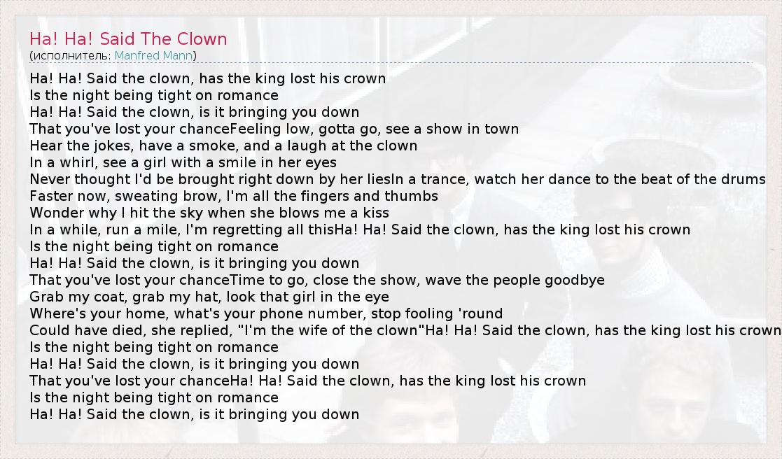 Could have died, she replied, "I'm the wife of the clown"Ha! Ha! Said the clown, has the king lost his crown