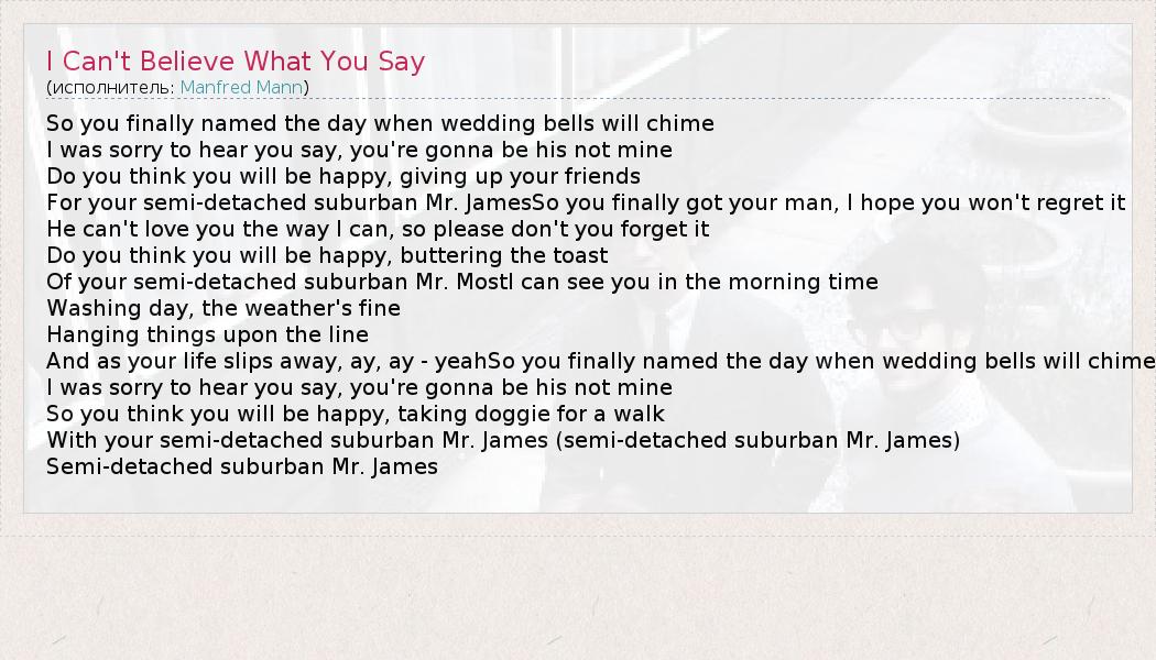 ГлавнаяИсполнителиManfred MannI Can't Believe What You Say