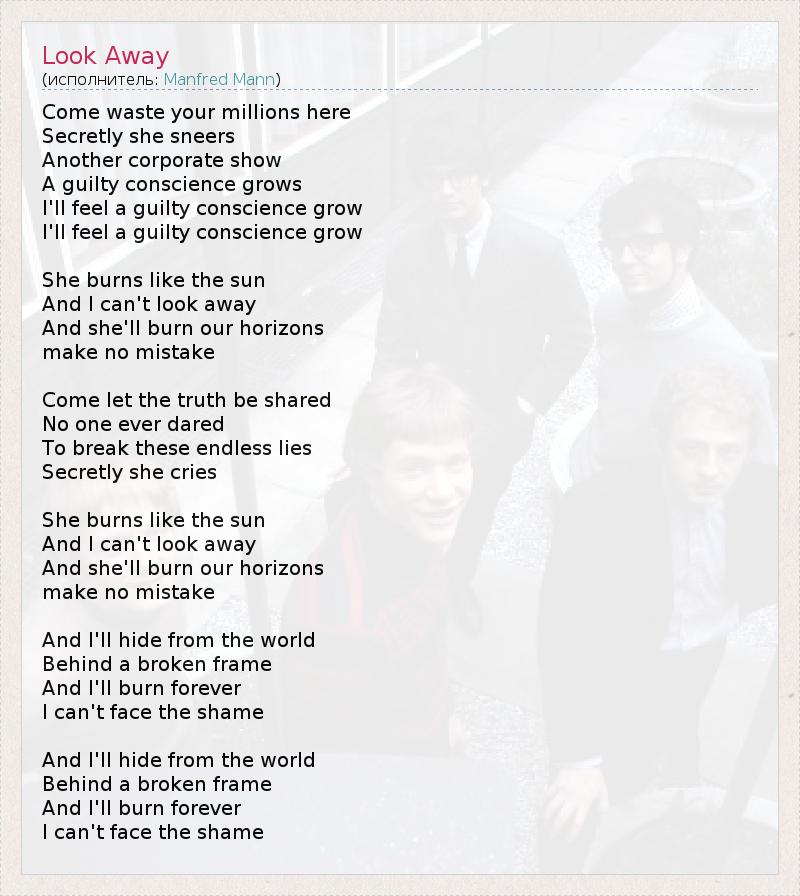 Давай, потрать здесь на ветер свои миллионы. Она тайком усмехается. Еще одно корпоративное шоу, Просыпается виноватая совесть. Я почувствую, как просыпается виноватая совесть. Я почувствую, как просыпается виноватая совесть. Она горит, как солнце, И я не могу оторвать от нее взгляда. Она спалит наши горизонты, Не сомневайтесь. Давай, поделись правдой. Никто и никогда не смел Положить конец этой бесконечной лжи. Она тайком плачет. Она горит, как солнце, И я не могу оторвать от нее взгляда. Она спалит наши горизонты, Не сомневайтесь. И я спрячусь от мира За сломанной рамкой. И буду гореть вечно, Я не могу принять позор. И я спрячусь от мира За сломанной рамкой. И буду гореть вечно, Я не могу принять позор.
