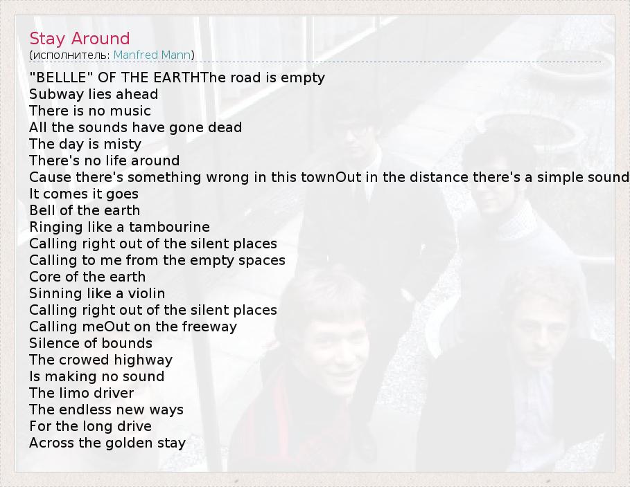 Это интересно:The Mann-Hugg Blues Brothers (таково было первое название коллектива) образовались в Лондоне в декабре 1962 года и оказались в эпицентре клубной блюз-революции (рядом с будущими чарт-конкурентами The Rolling Stones и The Yardbirds). В первом составе группы играли клавишник Манфред Мэнн (настоящее имя Манфред Любовиц, родился 21 октября 1940 года в Йоганнесбурге, Южная Африка), ударник Майк Хагг (Mike Hugg), гитарист Майк Викерс... продолжение