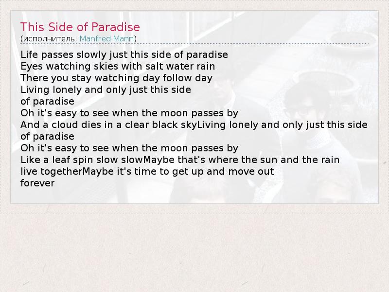 А как ты думаешь, о чем песня "This Side of Paradise" ?
