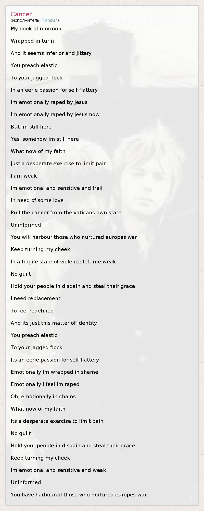 Это интересно:МЭНСАН (Mansun), английская брит-поп-группа. Основана в 1995 в г. Честер (недалеко от Ливерпуля).Основатели группы Пол Дрэпер (Paul Draper, вокал, гитара) и Стоув Кинг (Stove King, бас) познакомились в Ливерпульском художественном колледже. Оба любили DURAN DURAN, Дэвида Боуи и PINK FLOYD. Пол, сочинявший песни с 11 лет, немного играл на акустической гитаре, а Стоув начал осваивать бас-гитару только после того, как... продолжение