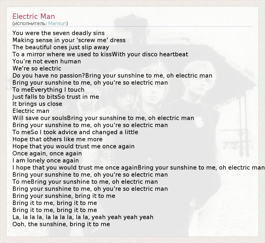 Do you have no passion?Bring your sunshine to me, oh electric man