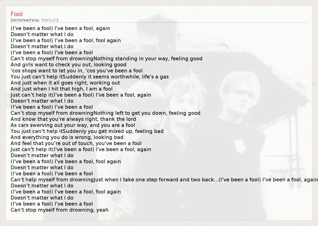 Can't help myself from drowningJust when I take one step forward and two back...(I've been a fool) I've been a fool, again