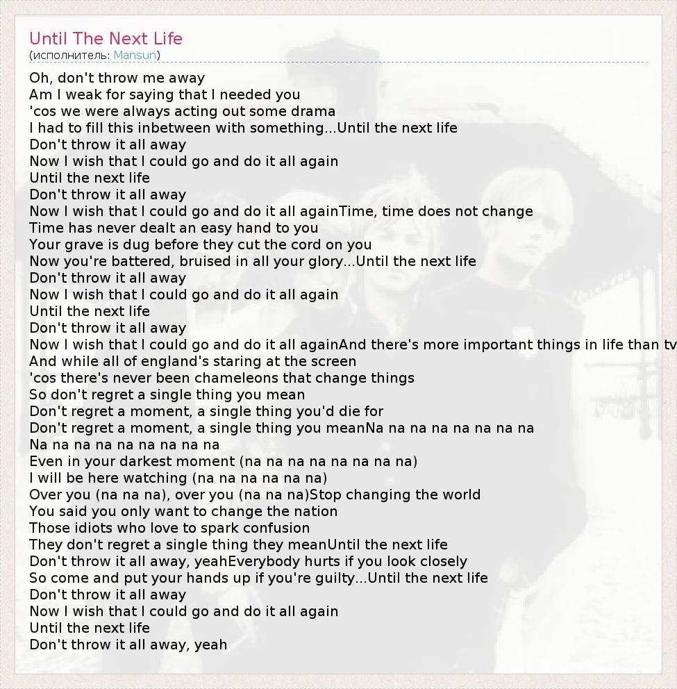 А как ты думаешь, о чем песня "Until The Next Life" ?