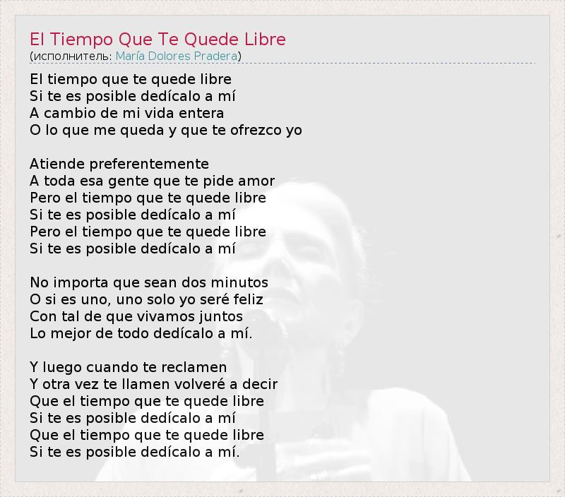 El tiempo que te quede libre Si te es posible dedícalo a mí A cambio de mi vida entera O lo que me queda y que te ofrezco yo Atiende preferentemente A toda esa gente que te pide amor Pero el tiempo que te quede libre Si te es posible dedícalo a mí Pero el tiempo que te quede libre Si te es posible dedícalo a mí No importa que sean dos minutos O si es uno, uno solo yo seré feliz Con tal de que vivamos juntos Lo mejor de todo dedícalo a mí. Y luego cuando te reclamen Y otra vez te llamen volveré a decir Que el tiempo que te quede libre Si te es posible dedícalo a mí Que el tiempo que te quede libre Si te es posible dedícalo a mí.