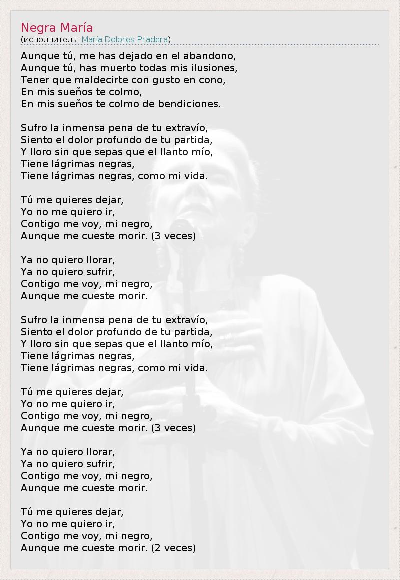 Aunque Вт, мне есть dejado En El abandono , Aunque Вт, имеет Muerto TODAS MIS Ilusiones , Tener Que maldecirte кон смак ан Cono , En неправильно sueños те Colmo , En неправильно sueños те Colmo де bendiciones . Sufro ла inmensa Пенья-де Ту extravío , Siento эль Dolor профундо де Ту Partida , Y Lloro грех Que SEPAS Que эль Llanto Mio , Tiene Lágrimas Неграс , Tiene Lágrimas Неграс , Комо ми вида . Tú меня quieres dejar , Йо нет меня Quiero ИК , Contigo меня Voy , миль негр , Aunque меня cueste Morir . ( 3 veces ) Я. не Quiero Llorar , Я. не Quiero sufrir , Contigo меня Voy , миль негр , Aunque меня cueste Morir . Sufro ла inmensa Пенья-де Ту extravío , Siento эль Dolor профундо де Ту Partida , Y Lloro грех Que SEPAS Que эль Llanto Mio , Tiene Lágrimas Неграс , Tiene Lágrimas Неграс , Комо ми вида . Tú меня quieres dejar , Йо нет меня Quiero ИК , Contigo меня Voy , миль негр , Aunque меня cueste Morir . ( 3 veces ) Я. не Quiero Llorar , Я. не Quiero sufrir , Contigo меня Voy , миль негр , Aunque меня cueste Morir . Tú меня quieres dejar , Йо нет меня Quiero ИК , Contigo меня Voy , миль негр , Aunque меня cueste Morir . ( 2 veces )