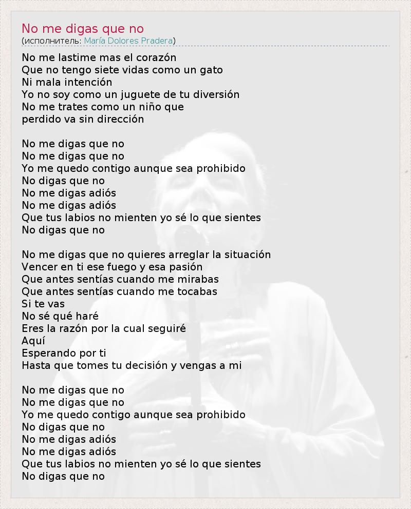 Не говори мне нет Хватит пинать моё сердце, У меня не 7 жизней, как у кошки. Никаких глупостей, Я не игрушка для твоих игр. Хватит обращаться со мной, как с ребёнком, который заблудившись, не знает куда ему идти Не говори мне «Нет» Не говори мне «Нет» Я останусь с тобой не смотря на запреты Не говори мне «Нет» Не говори мне «Прощай» Не говори мне «Прощай» Твои губы не лгут, я знаю, что ты чувствуешь Не говори мне «Нет» Не говори, что не хочешь быть в курсе дела Дабы не поддаться огню и страсти Что ты чувствовала раньше, смотря на меня Что ты чувствовала раньше, прикасаясь ко мне Если ты уйдёшь, Я не знаю, что мне делать Из-за тебя я продолжаю Здесь Ждать тебя Пока ты не решишься и не придёшь ко мне Не говори мне «Нет» Не говори мне «Нет» Я останусь с тобой не смотря на запреты Не говори мне «Нет» Не говори мне «Прощай» Не говори мне «Прощай» Твои губы не лгут, я знаю, что ты чувствуешь Не говори мне «Нет» Перевод: Тахинна
