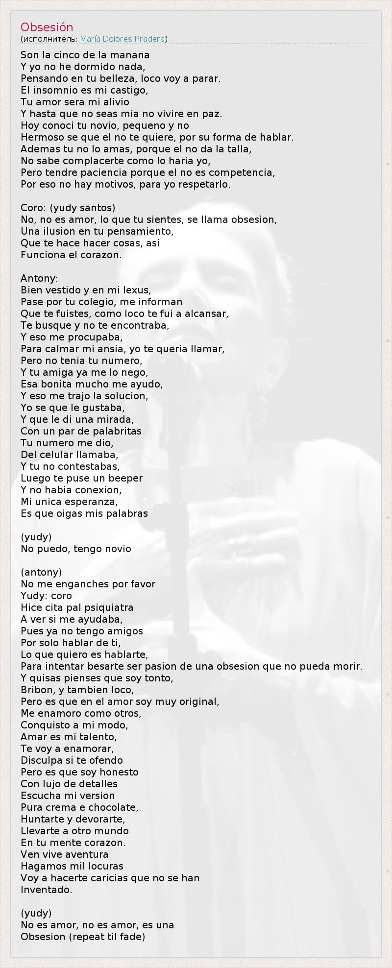Пять утра и я совсем не спал, Думая о твоей красоте, Схожу с ума. Бессонница - мое наказание, Твоя любовь будет моим утешением, И до тех пор, пока ты не будешь моей, Я не смогу жить спокойно. Сегодня я узнал, что твой парень, Низенький и не красивый, Что он не любит тебя Судя по его разговорам. Ты и сама его не любишь, Потому что мужик такого роста, Не может тебя удовлетворить, Как это сделал бы я, Но я потерплю, Потому что он мне не конкурент, Поэтому у меня нет причин уважать его. Джуди Сантос: Нет, это не любовь, То, что ты чувствуешь, называется одержимость, Иллюзия в твоих мыслях, Которая заставляет тебя делать такие вещи, Ведь так устроено сердце. Энтони: Прекрасно одетый и на своем Lexus, Я подъехал к твоему колледжу, Но мне сказали, что ты уже уехала, Как сумасшедший, я поехал тебя догонять Я искал и не находил тебя, И это меня встревожило, Чтобы успокоить мое волнение, Я хотел позвонить тебе, Но у меня не было твоего номера, А твоя подруга отказалась дать его мне, Но эта красотка все равно очень помогла мне, Ведь я нашел решение, Потому что я знал, что нравлюсь ей, И я подарил ей такой взгляд, И пару комплиментов, и я получил твой номер. Я постоянно звонил, Но ты не отвечала, Потом я послал тебе смс, но ответа не было, Моя единственная надежда на то Что ты услышишь мои слова. Джуди: Я не могу, у меня есть жених. Энтони: Не отказывай мне, пожалуйста! Я посетил психиатра В надежде, что он поможет мне, Так как у меня больше нет друзей из-за того, Что говорю только о тебе, Потому что все, чего хочу – это поговорить с тобой, Попытаться поцеловать тебя, Быть одержимым страстью, Которая никогда не умрет. И пусть ребята думают, что я - глупец, бездельник И еще сумасшедший, но дело в том, Что в любви я большой оригинал, Я влюбляюсь как другие, Завоевываю по-своему, любить - это мой талант, Я буду влюблять тебя, Прости, если я обижаю этим тебя, Но это потому, что я честный. Выслушай мои доводы внимательно ко всем деталям, Ты самый настоящий шоколад, Я спрячу тебя от всех и буду обожать тебя, Увезу тебя в другой мир, твой разум и сердце. Давай жить приключением, Давай сходить с ума, Я буду ласкать тебя, Как никто и никогда. Джуди: Это не любовь, это не любовь, это одержимость.