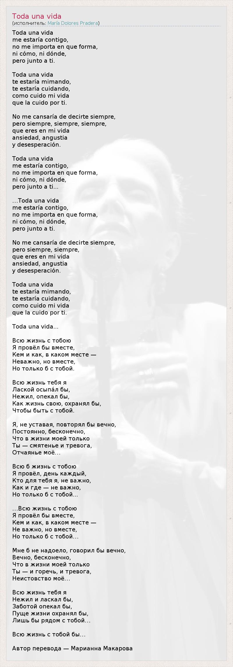 Toda una vida me estaría contigo, no me importa en que forma, ni cómo, ni dónde, pero junto a ti. Toda una vida te estaría mimando, te estaría cuidando, como cuido mi vida que la cuido por ti. No me cansaría de decirte siempre, pero siempre, siempre, siempre, que eres en mi vida ansiedad, angustia y desesperación. Toda una vida me estaría contigo, no me importa en que forma, ni cómo, ni dónde, pero junto a ti... …Toda una vida me estaría contigo, no me importa en que forma, ni cómo, ni dónde, pero junto a ti. No me cansaría de decirte siempre, pero siempre, siempre, que eres en mi vida ansiedad, angustia y desesperación. Toda una vida te estaría mimando, te estaría cuidando, como cuido mi vida que la cuido por ti. Toda una vida... Всю жизнь с тобою Я провёл бы вместе, Кем и как, в каком месте — Неважно, но вместе, Но только б с тобой. Всю жизнь тебя я Лаской осыпáл бы, Нежил, опекал бы, Как жизнь свою, охранял бы, Чтобы быть с тобой. Я, не уставая, повторял бы вечно, Постоянно, бесконечно, Что в жизни моей только Ты — смятенье и тревога, Отчаянье моё… Всю б жизнь с тобою Я провёл, день каждый, Кто для тебя я, не важно, Как и где — не важно, Но только б с тобой... …Всю жизнь с тобою Я провёл бы вместе, Кем и как, в каком месте — Не важно, но вместе, Но только б с тобой… Мне б не надоело, говорил бы вечно, Вечно, бесконечно, Что в жизни моей только Ты — и горечь, и тревога, Неистовство моё… Всю жизнь тебя я Нежил и ласкал бы, Заботой опекал бы, Пуще жизни охранял бы, Лишь бы рядом с тобой… Всю жизнь с тобой бы… Автор перевода — Марианна Макарова