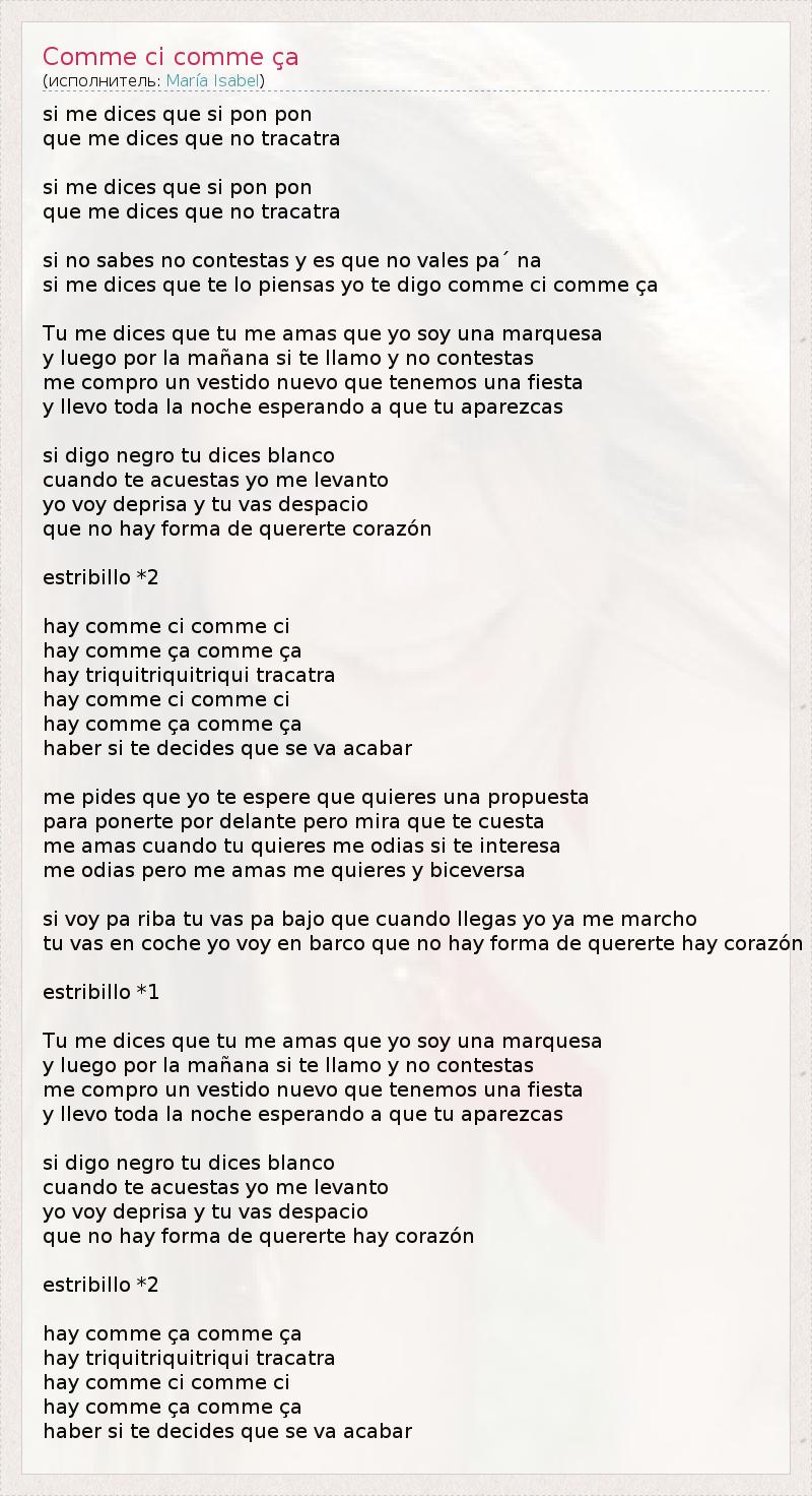 si me dices que si pon pon que me dices que no tracatra si me dices que si pon pon que me dices que no tracatra si no sabes no contestas y es que no vales pa´ na si me dices que te lo piensas yo te digo comme ci comme ça Tu me dices que tu me amas que yo soy una marquesa y luego por la mañana si te llamo y no contestas me compro un vestido nuevo que tenemos una fiesta y llevo toda la noche esperando a que tu aparezcas si digo negro tu dices blanco cuando te acuestas yo me levanto yo voy deprisa y tu vas despacio que no hay forma de quererte corazón estribillo *2 hay comme ci comme ci hay comme ça comme ça hay triquitriquitriqui tracatra hay comme ci comme ci hay comme ça comme ça haber si te decides que se va acabar me pides que yo te espere que quieres una propuesta para ponerte por delante pero mira que te cuesta me amas cuando tu quieres me odias si te interesa me odias pero me amas me quieres y biceversa si voy pa riba tu vas pa bajo que cuando llegas yo ya me marcho tu vas en coche yo voy en barco que no hay forma de quererte hay corazón estribillo *1 Tu me dices que tu me amas que yo soy una marquesa y luego por la mañana si te llamo y no contestas me compro un vestido nuevo que tenemos una fiesta y llevo toda la noche esperando a que tu aparezcas si digo negro tu dices blanco cuando te acuestas yo me levanto yo voy deprisa y tu vas despacio que no hay forma de quererte hay corazón estribillo *2 hay comme ça comme ça hay triquitriquitriqui tracatra hay comme ci comme ci hay comme ça comme ça haber si te decides que se va acabar