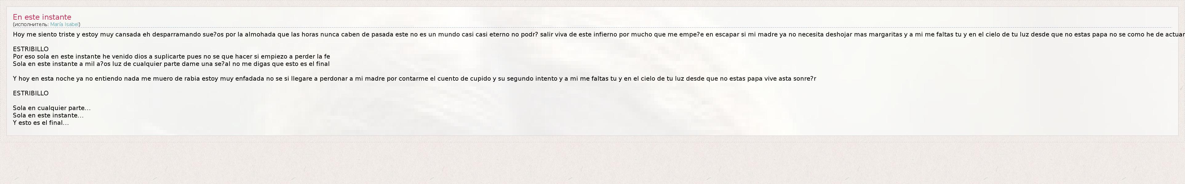 Hoy me siento triste y estoy muy cansada eh desparramando sue?os por la almohada que las horas nunca caben de pasada este no es un mundo casi casi eterno no podr? salir viva de este infierno por mucho que me empe?e en escapar si mi madre ya no necesita deshojar mas margaritas y a mi me faltas tu y en el cielo de tu luz desde que no estas papa no se como he de actuar