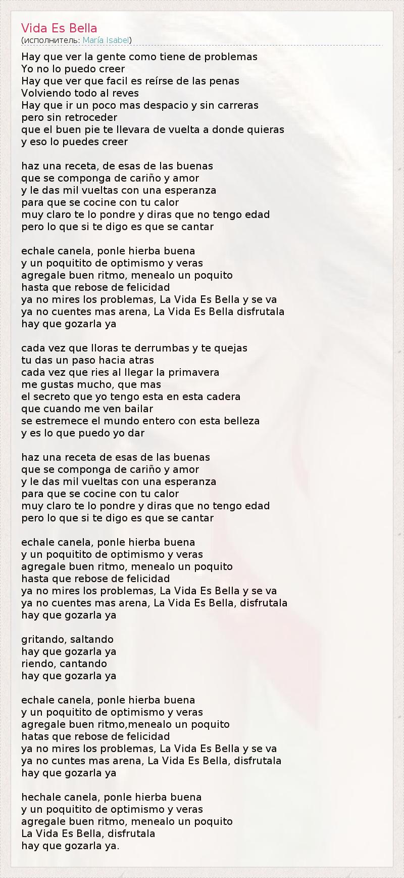 Hay que ver la gente como tiene de problemas Yo no lo puedo creer Hay que ver que facil es reírse de las penas Volviendo todo al reves Hay que ir un poco mas despacio y sin carreras pero sin retroceder que el buen pie te llevara de vuelta a donde quieras y eso lo puedes creer haz una receta, de esas de las buenas que se componga de cariño y amor y le das mil vueltas con una esperanza para que se cocine con tu calor muy claro te lo pondre y diras que no tengo edad pero lo que si te digo es que se cantar echale canela, ponle hierba buena y un poquitito de optimismo y veras agregale buen ritmo, menealo un poquito hasta que rebose de felicidad ya no mires los problemas, La Vida Es Bella y se va ya no cuentes mas arena, La Vida Es Bella disfrutala hay que gozarla ya cada vez que lloras te derrumbas y te quejas tu das un paso hacia atras cada vez que ries al llegar la primavera me gustas mucho, que mas el secreto que yo tengo esta en esta cadera que cuando me ven bailar se estremece el mundo entero con esta belleza y es lo que puedo yo dar haz una receta de esas de las buenas que se componga de cariño y amor y le das mil vueltas con una esperanza para que se cocine con tu calor muy claro te lo pondre y diras que no tengo edad pero lo que si te digo es que se cantar echale canela, ponle hierba buena y un poquitito de optimismo y veras agregale buen ritmo, menealo un poquito hasta que rebose de felicidad ya no mires los problemas, La Vida Es Bella y se va ya no cuentes mas arena, La Vida Es Bella, disfrutala hay que gozarla ya gritando, saltando hay que gozarla ya riendo, cantando hay que gozarla ya echale canela, ponle hierba buena y un poquitito de optimismo y veras agregale buen ritmo,menealo un poquito hatas que rebose de felicidad ya no mires los problemas, La Vida Es Bella y se va ya no cuntes mas arena, La Vida Es Bella, disfrutala hay que gozarla ya hechale canela, ponle hierba buena y un poquitito de optimismo y veras agregale buen ritmo, menealo un poquito La Vida Es Bella, disfrutala hay que gozarla ya.
