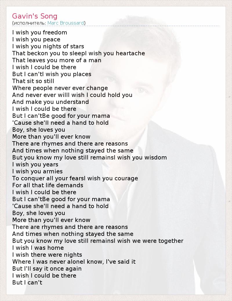 I wish you freedom I wish you peace I wish you nights of stars That beckon you to sleepI wish you heartache That leaves you more of a man I wish I could be there But I can'tI wish you places That sit so still Where people never ever change And never ever willI wish I could hold you And make you understand I wish I could be there But I can'tBe good for your mama 'Cause she'll need a hand to hold Boy, she loves you More than you'll ever know There are rhymes and there are reasons And times when nothing stayed the same But you know my love still remainsI wish you wisdom I wish you years I wish you armies To conquer all your fearsI wish you courage For all that life demands I wish I could be there But I can'tBe good for your mama 'Cause she'll need a hand to hold Boy, she loves you More than you'll ever know There are rhymes and there are reasons And times when nothing stayed the same But you know my love still remainsI wish we were together I wish I was home I wish there were nights Where I was never aloneI know, I've said it But I'll say it once again I wish I could be there But I can't