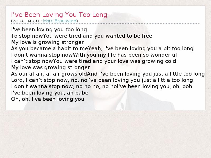 I've been loving you too long To stop nowYou were tired and you wanted to be free My love is growing stronger As you became a habit to meYeah, I've been loving you a bit too long I don't wanna stop nowWith you my life has been so wonderful I can't stop nowYou were tired and your love was growing cold My love was growing stronger As our affair, affair grows oldAnd I've been loving you just a little too long Lord, I can't stop now, no, noI've been loving you just a little too long I don't wanna stop now, no no no, no noI've been loving you, oh, ooh I've been loving you, ah babe Oh, oh, I've been loving you