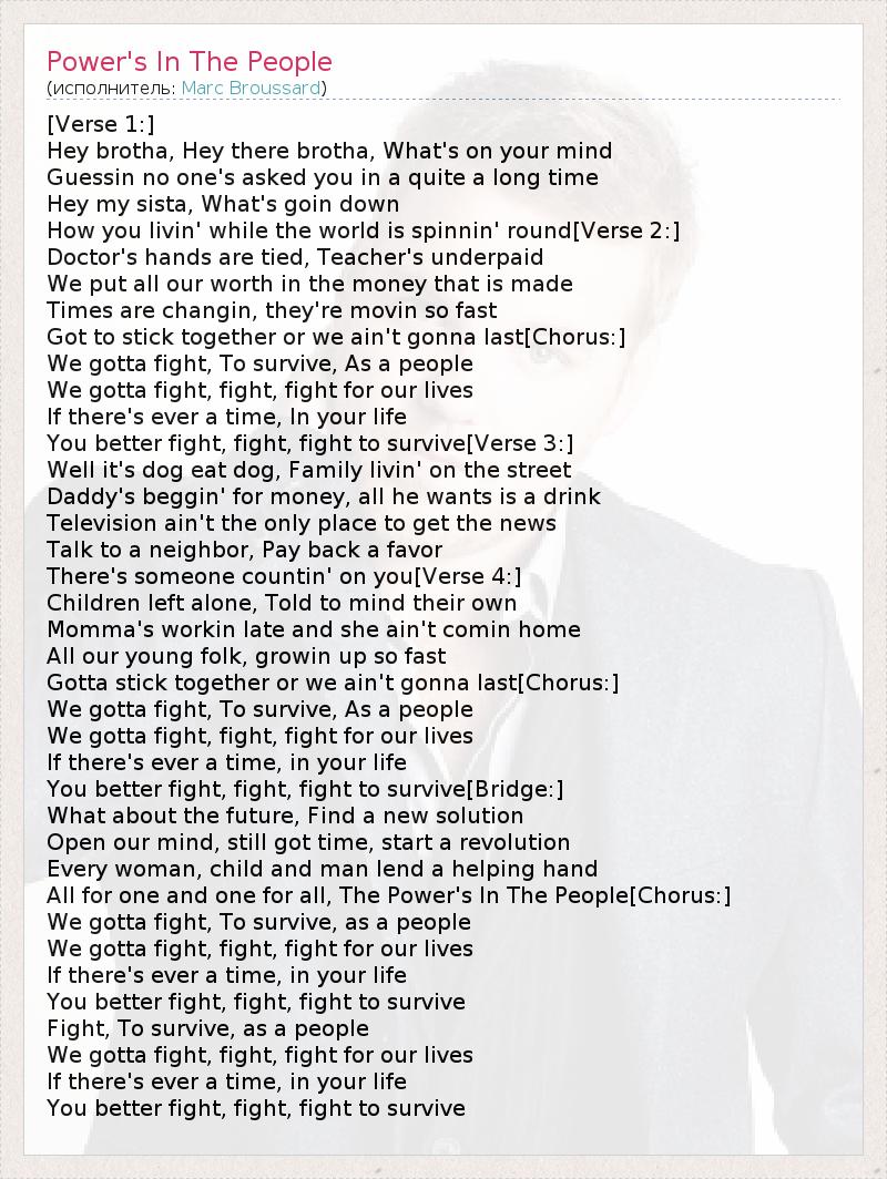 [Verse 1:] Hey brotha, Hey there brotha, What's on your mind Guessin no one's asked you in a quite a long time Hey my sista, What's goin down How you livin' while the world is spinnin' round[Verse 2:] Doctor's hands are tied, Teacher's underpaid We put all our worth in the money that is made Times are changin, they're movin so fast Got to stick together or we ain't gonna last[Chorus:] We gotta fight, To survive, As a people We gotta fight, fight, fight for our lives If there's ever a time, In your life You better fight, fight, fight to survive[Verse 3:] Well it's dog eat dog, Family livin' on the street Daddy's beggin' for money, all he wants is a drink Television ain't the only place to get the news Talk to a neighbor, Pay back a favor There's someone countin' on you[Verse 4:] Children left alone, Told to mind their own Momma's workin late and she ain't comin home All our young folk, growin up so fast Gotta stick together or we ain't gonna last[Chorus:] We gotta fight, To survive, As a people We gotta fight, fight, fight for our lives If there's ever a time, in your life You better fight, fight, fight to survive[Bridge:] What about the future, Find a new solution Open our mind, still got time, start a revolution Every woman, child and man lend a helping hand All for one and one for all, The Power's In The People[Chorus:] We gotta fight, To survive, as a people We gotta fight, fight, fight for our lives If there's ever a time, in your life You better fight, fight, fight to survive Fight, To survive, as a people We gotta fight, fight, fight for our lives If there's ever a time, in your life You better fight, fight, fight to survive