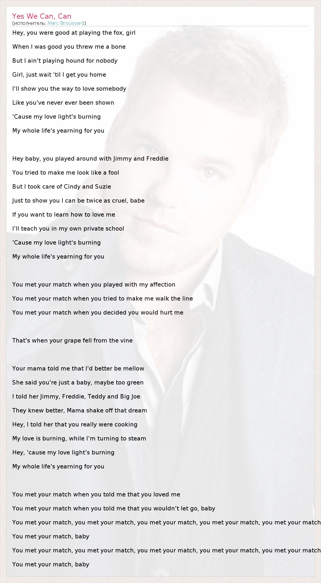 Hey, you were good at playing the fox, girl When I was good you threw me a bone But I ain't playing hound for nobody Girl, just wait 'til I get you home I'll show you the way to love somebody Like you've never ever been shown 'Cause my love light's burning My whole life's yearning for you Hey baby, you played around with Jimmy and Freddie You tried to make me look like a fool But I took care of Cindy and Suzie Just to show you I can be twice as cruel, babe If you want to learn how to love me I'll teach you in my own private school 'Cause my love light's burning My whole life's yearning for you You met your match when you played with my affection You met your match when you tried to make me walk the line You met your match when you decided you would hurt me That's when your grape fell from the vine Your mama told me that I'd better be mellow She said you're just a baby, maybe too green I told her Jimmy, Freddie, Teddy and Big Joe They knew better, Mama shake off that dream Hey, I told her that you really were cooking My love is burning, while I'm turning to steam Hey, 'cause my love light's burning My whole life's yearning for you You met your match when you told me that you loved me You met your match when you told me that you wouldn't let go, baby You met your match, you met your match, you met your match, you met your match, you met your match You met your match, baby You met your match, you met your match, you met your match, you met your match, you met your match You met your match, baby