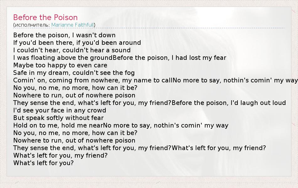 Before the poison, I wasn't down If you'd been there, if you'd been around I couldn't hear, couldn't hear a sound I was floating above the groundBefore the poison, I had lost my fear Maybe too happy to even care Safe in my dream, couldn't see the fog Comin' on, coming from nowhere, my name to callNo more to say, nothin's comin' my way No you, no me, no more, how can it be? Nowhere to run, out of nowhere poison They sense the end, what's left for you, my friend?Before the poison, I'd laugh out loud I'd see your face in any crowd But speak softly without fear Hold on to me, hold me nearNo more to say, nothin's comin' my way No you, no me, no more, how can it be? Nowhere to run, out of nowhere poison They sense the end, what's left for you, my friend?What's left for you, my friend? What's left for you, my friend? What's left for you?