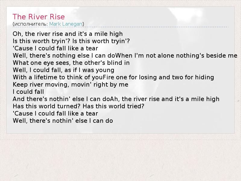 Oh, the river rise and it's a mile high Is this worth tryin'? Is this worth tryin'? 'Cause I could fall like a tear Well, there's nothing else I can doWhen I'm not alone nothing's beside me What one eye sees, the other's blind in Well, I could fall, as if I was young With a lifetime to think of youFire one for losing and two for hiding Keep river moving, movin' right by me I could fall And there's nothin' else I can doAh, the river rise and it's a mile high Has this world turned? Has this world tried? 'Cause I could fall like a tear Well, there's nothin' else I can do