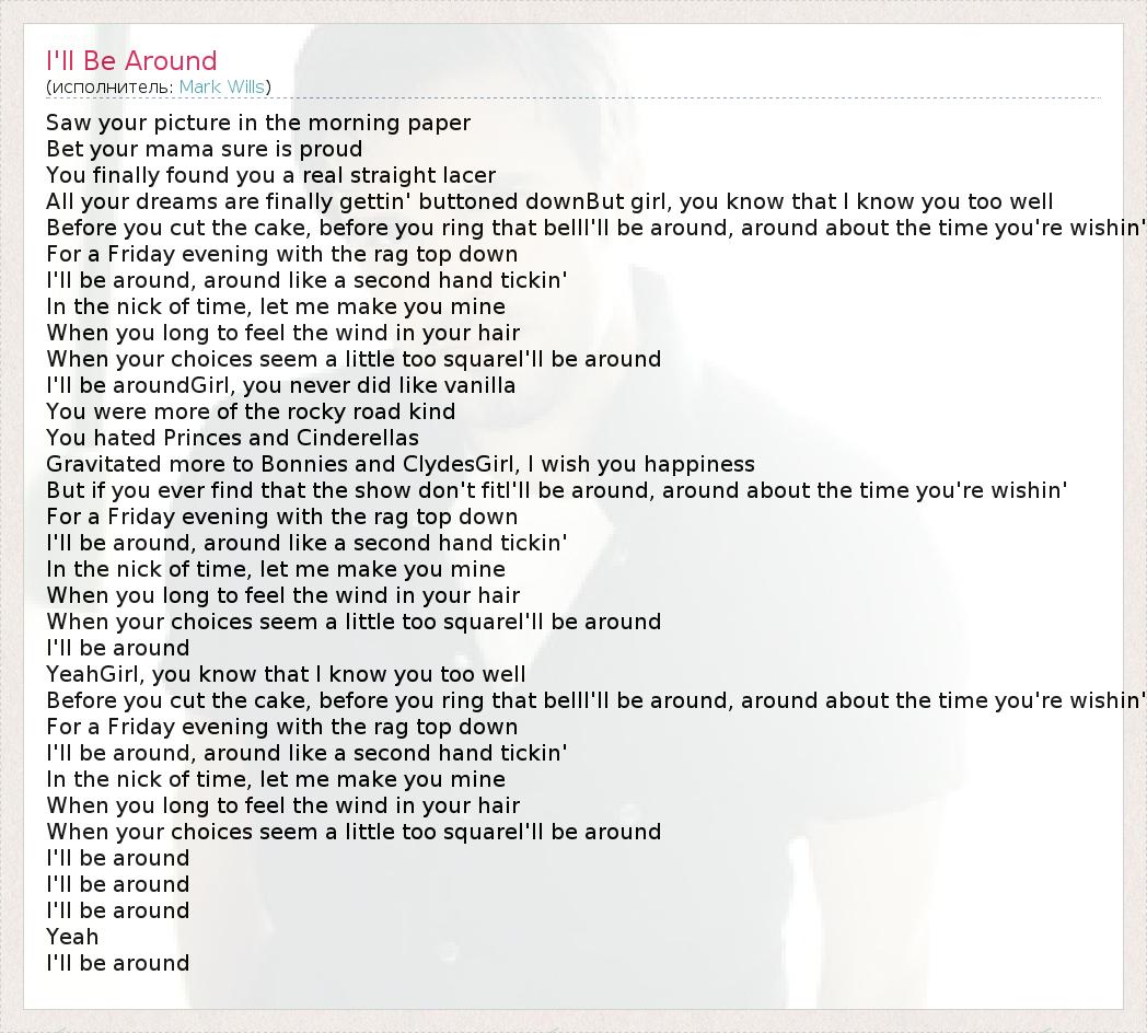 Saw your picture in the morning paper Bet your mama sure is proud You finally found you a real straight lacer All your dreams are finally gettin' buttoned downBut girl, you know that I know you too well Before you cut the cake, before you ring that bellI'll be around, around about the time you're wishin' For a Friday evening with the rag top down I'll be around, around like a second hand tickin' In the nick of time, let me make you mine When you long to feel the wind in your hair When your choices seem a little too squareI'll be around I'll be aroundGirl, you never did like vanilla You were more of the rocky road kind You hated Princes and Cinderellas Gravitated more to Bonnies and ClydesGirl, I wish you happiness But if you ever find that the show don't fitI'll be around, around about the time you're wishin' For a Friday evening with the rag top down I'll be around, around like a second hand tickin' In the nick of time, let me make you mine When you long to feel the wind in your hair When your choices seem a little too squareI'll be around I'll be around YeahGirl, you know that I know you too well Before you cut the cake, before you ring that bellI'll be around, around about the time you're wishin' For a Friday evening with the rag top down I'll be around, around like a second hand tickin' In the nick of time, let me make you mine When you long to feel the wind in your hair When your choices seem a little too squareI'll be around I'll be around I'll be around I'll be around Yeah I'll be around