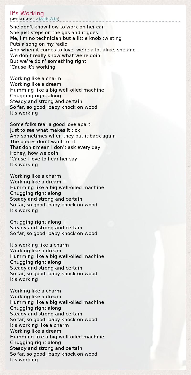She don't know how to work on her car She just steps on the gas and it goes Me, I'm no technician but a little knob twisting Puts a song on my radio And when it comes to love, we're a lot alike, she and I We don't really know what we're doin' But we're doin' something right 'Cause it's working Working like a charm Working like a dream Humming like a big well-oiled machine Chugging right along Steady and strong and certain So far, so good, baby knock on wood It's working Some folks tear a good love apart Just to see what makes it tick And sometimes when they put it back again The pieces don't want to fit That don't mean I don't ask every day Honey, how we doin' 'Cause I love to hear her say It's working Working like a charm Working like a dream Humming like a big well-oiled machine Chugging right along Steady and strong and certain So far, so good, baby knock on wood It's working Chugging right along Steady and strong and certain So far, so good, baby knock on wood It's working like a charm Working like a dream Humming like a big well-oiled machine Chugging right along Steady and strong and certain So far, so good, baby knock on wood It's working Working like a charm Working like a dream Humming like a big well-oiled machine Chugging right along Steady and strong and certain So far, so good, baby knock on wood It's working like a charm Working like a dream Humming like a big well-oiled machine Chugging right along Steady and strong and certain So far, so good, baby knock on wood It's working