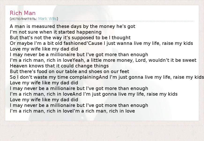 I'm a rich man, rich in loveAnd I'm just gonna live my life, raise my kids