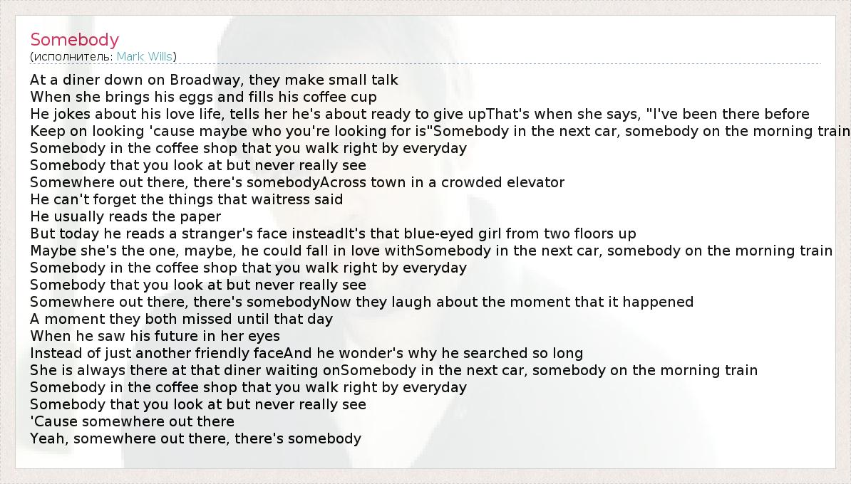 At a diner down on Broadway, they make small talk When she brings his eggs and fills his coffee cup He jokes about his love life, tells her he's about ready to give upThat's when she says, "I've been there before Keep on looking 'cause maybe who you're looking for is"Somebody in the next car, somebody on the morning train Somebody in the coffee shop that you walk right by everyday Somebody that you look at but never really see Somewhere out there, there's somebodyAcross town in a crowded elevator He can't forget the things that waitress said He usually reads the paper But today he reads a stranger's face insteadIt's that blue-eyed girl from two floors up Maybe she's the one, maybe, he could fall in love withSomebody in the next car, somebody on the morning train Somebody in the coffee shop that you walk right by everyday Somebody that you look at but never really see Somewhere out there, there's somebodyNow they laugh about the moment that it happened A moment they both missed until that day When he saw his future in her eyes Instead of just another friendly faceAnd he wonder's why he searched so long She is always there at that diner waiting onSomebody in the next car, somebody on the morning train Somebody in the coffee shop that you walk right by everyday Somebody that you look at but never really see 'Cause somewhere out there Yeah, somewhere out there, there's somebody