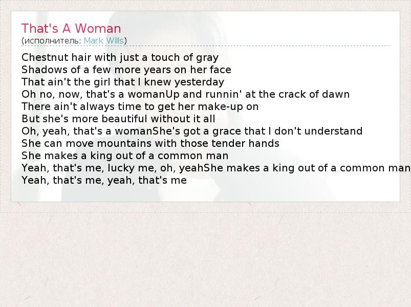 А как ты думаешь, о чем песня "That's A Woman" ?
