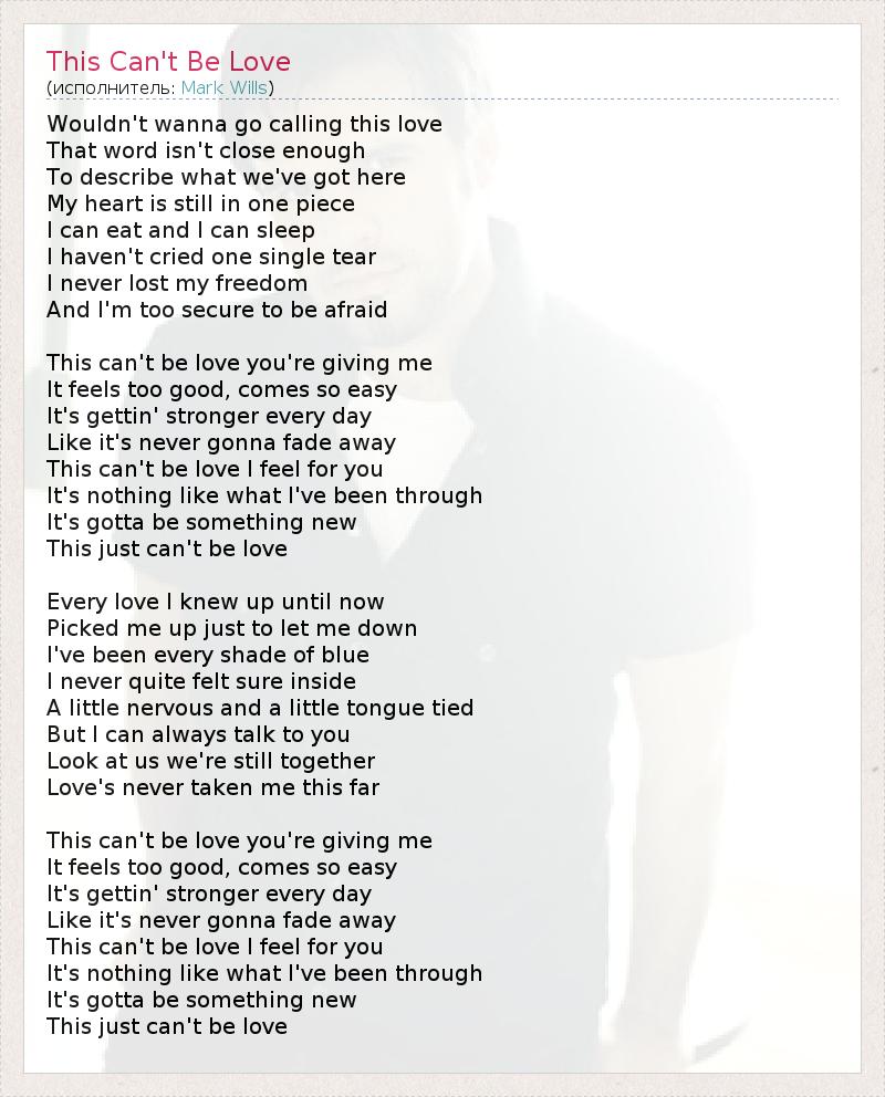 Wouldn't wanna go calling this love That word isn't close enough To describe what we've got here My heart is still in one piece I can eat and I can sleep I haven't cried one single tear I never lost my freedom And I'm too secure to be afraid This can't be love you're giving me It feels too good, comes so easy It's gettin' stronger every day Like it's never gonna fade away This can't be love I feel for you It's nothing like what I've been through It's gotta be something new This just can't be love Every love I knew up until now Picked me up just to let me down I've been every shade of blue I never quite felt sure inside A little nervous and a little tongue tied But I can always talk to you Look at us we're still together Love's never taken me this far This can't be love you're giving me It feels too good, comes so easy It's gettin' stronger every day Like it's never gonna fade away This can't be love I feel for you It's nothing like what I've been through It's gotta be something new This just can't be love