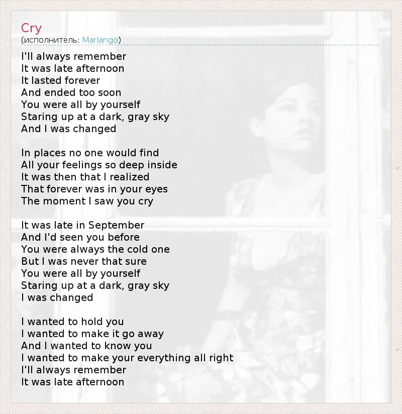 I'll always remember It was late afternoon It lasted forever And ended too soon You were all by yourself Staring up at a dark, gray sky And I was changed In places no one would find All your feelings so deep inside It was then that I realized That forever was in your eyes The moment I saw you cry It was late in September And I'd seen you before You were always the cold one But I was never that sure You were all by yourself Staring up at a dark, gray sky I was changed I wanted to hold you I wanted to make it go away And I wanted to know you I wanted to make your everything all right I'll always remember It was late afternoon