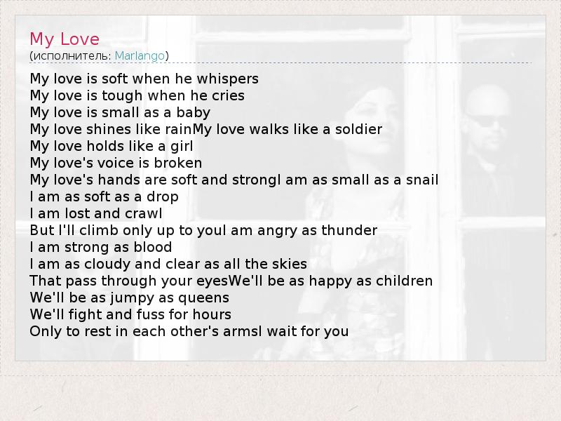 My love is soft when he whispers My love is tough when he cries My love is small as a baby My love shines like rainMy love walks like a soldier My love holds like a girl My love's voice is broken My love's hands are soft and strongI am as small as a snail I am as soft as a drop I am lost and crawl But I'll climb only up to youI am angry as thunder I am strong as blood I am as cloudy and clear as all the skies That pass through your eyesWe'll be as happy as children We'll be as jumpy as queens We'll fight and fuss for hours Only to rest in each other's armsI wait for you