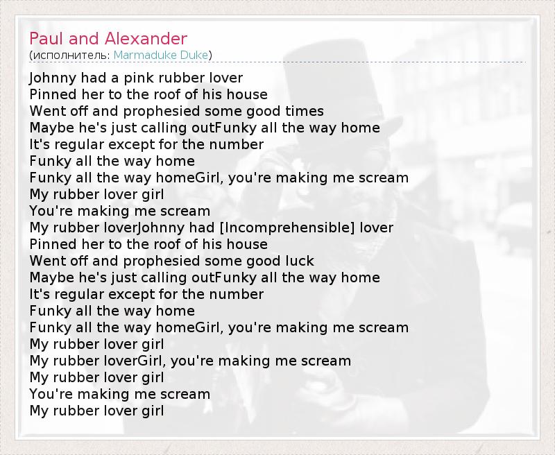 Johnny had a pink rubber lover Pinned her to the roof of his house Went off and prophesied some good times Maybe he's just calling outFunky all the way home It's regular except for the number Funky all the way home Funky all the way homeGirl, you're making me scream My rubber lover girl You're making me scream My rubber loverJohnny had [Incomprehensible] lover Pinned her to the roof of his house Went off and prophesied some good luck Maybe he's just calling outFunky all the way home It's regular except for the number Funky all the way home Funky all the way homeGirl, you're making me scream My rubber lover girl My rubber loverGirl, you're making me scream My rubber lover girl You're making me scream My rubber lover girl