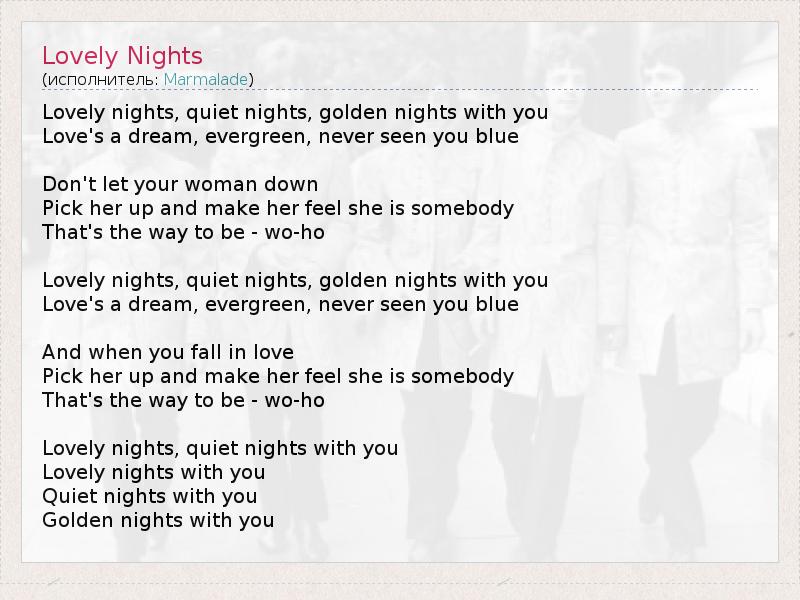 Lovely nights, quiet nights, golden nights with you Love's a dream, evergreen, never seen you blue Don't let your woman down Pick her up and make her feel she is somebody That's the way to be - wo-ho Lovely nights, quiet nights, golden nights with you Love's a dream, evergreen, never seen you blue And when you fall in love Pick her up and make her feel she is somebody That's the way to be - wo-ho Lovely nights, quiet nights with you Lovely nights with you Quiet nights with you Golden nights with you