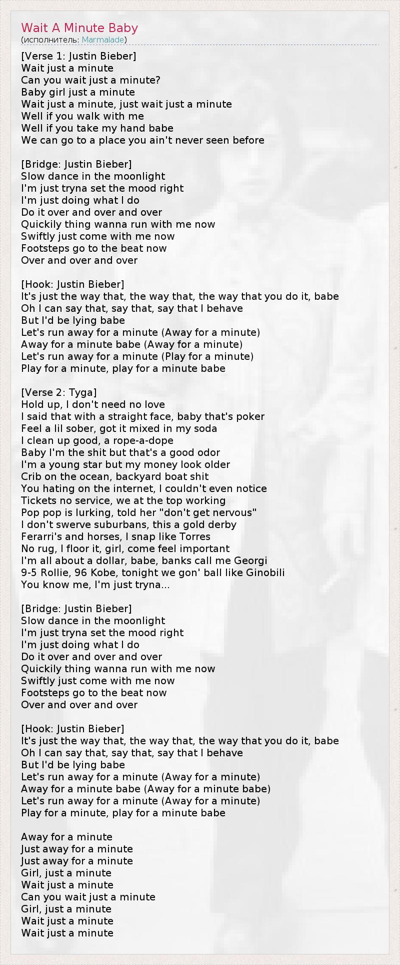 [Verse 1: Justin Bieber] Подожди минутку, Ты можешь подождать минутку? Малышка, всего одну минуту, Подожди минутку, просто подожди всего минутку, И если ты пойдёшь со мной, Если ты возьмёшь меня за руку, Мы пойдём в такое место, которое ты ещё не видела. [Bridge: Justin Bieber] Медленный танец в лунном свете... Я просто пытаюсь создать нужную атмосферу, Я просто делаю то, что делаю, Делаю это снова и снова и снова. Маленький вопрос - хочешь убежать со мной сейчас? Поспеши, пойдём сейчас со мной. Звук шагов сливается с ритмом, Снова и снова и снова... [Hook: Justin Bieber] Всё дело в том, как ты делаешь это, малышка. Я мог бы сказать, что веду себя как следует, Но я бы солгал, крошка. Давай убежим на минутку (Убежим на минутку) Убежим на минутку, малышка (Убежим на минутку) Давай убежим на минутку (Поиграем минутку) Поиграем минутку, поиграем минутку, малышка. [Verse 2: Tyga] Подожди, "Мне не нужна любовь", - Я сказал это с честным лицом, детка, как в покере. 1 Немного прихожу в себя, выпивая стакан содовой. Я побеждаю с большим перевесом, вымотав, а затем уложив противника. Малышка, я - д**ьмо, но с хорошим запахом, Я молодая звезда, но мои деньги выглядят старше. Домик у океана, маленькая лодка во дворе, - классная вещь! Ты изливаешь ненависть в интернете, а я даже не заметил - Объелся дури, к тому же нет сети. Мы на вершине, за работой. Папик незаметно подкрадывается со словами "Не дёргайся". Я не сворачиваю с пригородных шоссе, это золотое дерби, Феррари и лошади, я попадаю в десятку, как Торрес. 3 Никаких ковров, детка, я делаю это на полу, давай, почувствуй свою важность, Я купаюсь в долларах, в банках ко мне обращаются "Джорджи". 4 9-5 Rollie, 5 96 Kobe, 6 сегодня ночью мы сыграем как Джинобили, 7 Ты знаешь меня, я просто пытаюсь... [Bridge: Justin Bieber] Медленный танец в лунном свете... Я просто пытаюсь создать нужную атмосферу, Я просто делаю то, что делаю, Делаю это снова и снова и снова. Маленький вопрос - хочешь убежать со мной сейчас? Поспеши, пойдём сейчас со мной. Звук шагов сливается с ритмом, Снова и снова и снова... [Hook: Justin Bieber] Всё дело в том, как ты делаешь это, малышка. Я мог бы сказать, что веду себя как следует, Но я бы солгал, крошка. Давай убежим на минутку (Убежим на минутку) Убежим на минутку, малышка (Убежим на минутку) Давай убежим на минутку (Поиграем минутку) Поиграем минутку, поиграем минутку, малышка. Сбежим на минутку, Просто сбежим на минутку, Просто сбежим на минутку, Малышка, всего минуту, Подожди всего минуту, Ты можешь подождать всего минуту? Малышка, всего минуту, Подожди всего минуту, Подожди всего минуту... 1 - при игре в покер часто применяется такой стратегический приём как блеф, благодаря которому можно выигрывать с худшими картами, чем у противника 2 - техника "Rope-a-Dope" - термин введен Мухаммедом Али. Техника состоит в том, чтобы вымотать противника, не борясь и принимая удары. Атаковать его уже усталого и победить. 3 - Фернандо Торрес - испанский футболист, нападающий лондонского «Челси» и сборной Испании. 4 - Georgi, вероятно, сокращение от George Washington - первый американский президент. Изображён на купюре в 1 доллар. В контексте песни это намёк на то, что Tyga считают богатеньким мальчиком 5 - Rollie Massimino - американский баскетболист, игрок команды Cleveland State Vikings 6 - Kobe Bryant (род. 1978 -) - американский профессиональный баскетболист, атакующий защитник «Лос-Анджелес Лейкерс», выступающий в НБА. В 96-ом году получил первый приз в своей карь