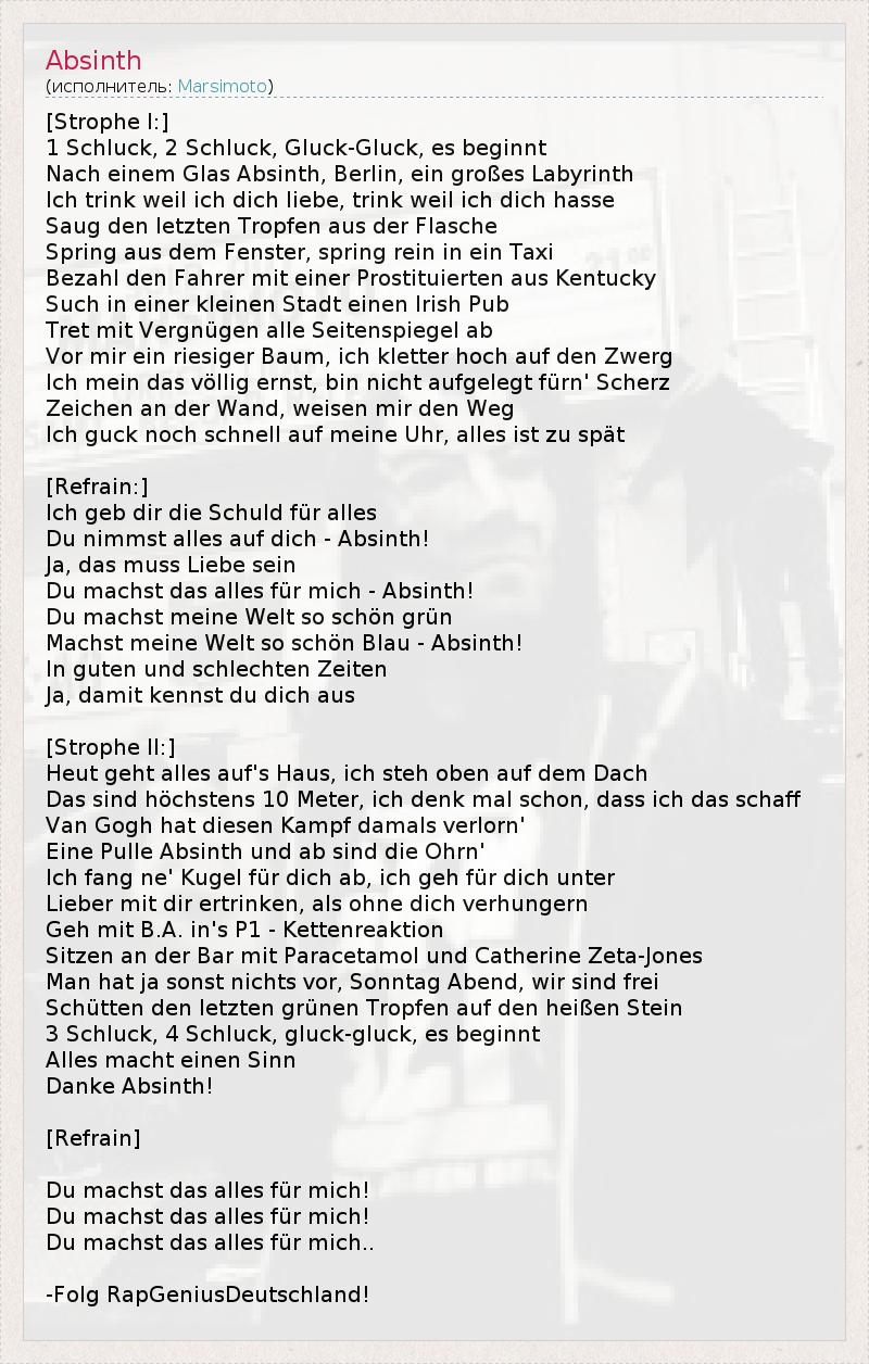 [Strophe I:] 1 Schluck, 2 Schluck, Gluck-Gluck, es beginnt Nach einem Glas Absinth, Berlin, ein großes Labyrinth Ich trink weil ich dich liebe, trink weil ich dich hasse Saug den letzten Tropfen aus der Flasche Spring aus dem Fenster, spring rein in ein Taxi Bezahl den Fahrer mit einer Prostituierten aus Kentucky Such in einer kleinen Stadt einen Irish Pub Tret mit Vergnügen alle Seitenspiegel ab Vor mir ein riesiger Baum, ich kletter hoch auf den Zwerg Ich mein das völlig ernst, bin nicht aufgelegt fürn' Scherz Zeichen an der Wand, weisen mir den Weg Ich guck noch schnell auf meine Uhr, alles ist zu spät [Refrain:] Ich geb dir die Schuld für alles Du nimmst alles auf dich - Absinth! Ja, das muss Liebe sein Du machst das alles für mich - Absinth! Du machst meine Welt so schön grün Machst meine Welt so schön Blau - Absinth! In guten und schlechten Zeiten Ja, damit kennst du dich aus [Strophe II:] Heut geht alles auf's Haus, ich steh oben auf dem Dach Das sind höchstens 10 Meter, ich denk mal schon, dass ich das schaff Van Gogh hat diesen Kampf damals verlorn' Eine Pulle Absinth und ab sind die Ohrn' Ich fang ne' Kugel für dich ab, ich geh für dich unter Lieber mit dir ertrinken, als ohne dich verhungern Geh mit B.A. in's P1 - Kettenreaktion Sitzen an der Bar mit Paracetamol und Catherine Zeta-Jones Man hat ja sonst nichts vor, Sonntag Abend, wir sind frei Schütten den letzten grünen Tropfen auf den heißen Stein 3 Schluck, 4 Schluck, gluck-gluck, es beginnt Alles macht einen Sinn Danke Absinth! [Refrain] Du machst das alles für mich! Du machst das alles für mich! Du machst das alles für mich.. -Folg RapGeniusDeutschland!