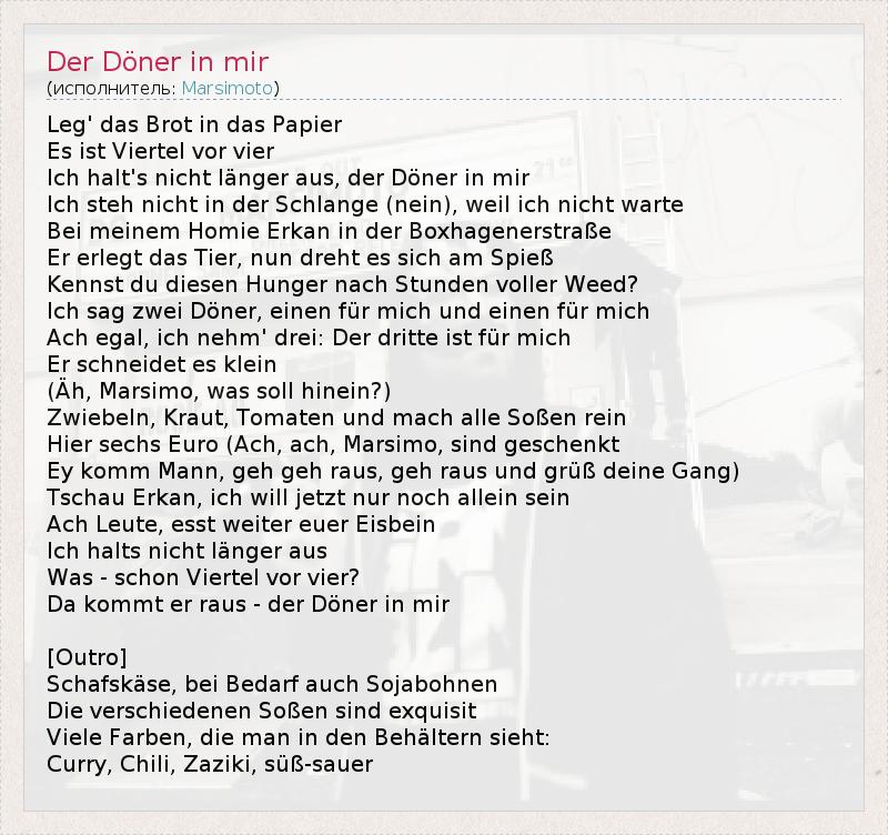 Leg' das Brot in das Papier Es ist Viertel vor vier Ich halt's nicht länger aus, der Döner in mir Ich steh nicht in der Schlange (nein), weil ich nicht warte Bei meinem Homie Erkan in der Boxhagenerstraße Er erlegt das Tier, nun dreht es sich am Spieß Kennst du diesen Hunger nach Stunden voller Weed? Ich sag zwei Döner, einen für mich und einen für mich Ach egal, ich nehm' drei: Der dritte ist für mich Er schneidet es klein (Äh, Marsimo, was soll hinein?) Zwiebeln, Kraut, Tomaten und mach alle Soßen rein Hier sechs Euro (Ach, ach, Marsimo, sind geschenkt Ey komm Mann, geh geh raus, geh raus und grüß deine Gang) Tschau Erkan, ich will jetzt nur noch allein sein Ach Leute, esst weiter euer Eisbein Ich halts nicht länger aus Was - schon Viertel vor vier? Da kommt er raus - der Döner in mir [Outro] Schafskäse, bei Bedarf auch Sojabohnen Die verschiedenen Soßen sind exquisit Viele Farben, die man in den Behältern sieht: Curry, Chili, Zaziki, süß-sauer