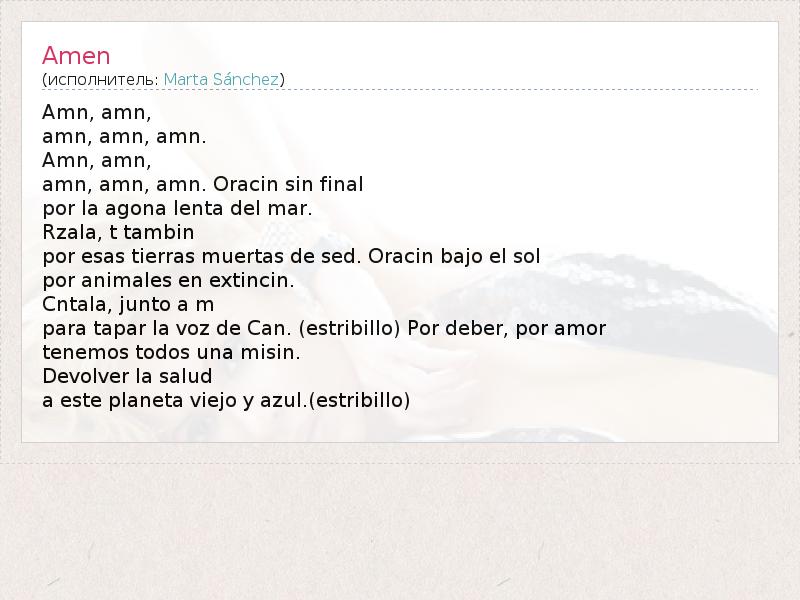 Amn, amn, amn, amn, amn. Amn, amn, amn, amn, amn. Oracin sin final por la agona lenta del mar. Rzala, t tambin por esas tierras muertas de sed. Oracin bajo el sol por animales en extincin. Cntala, junto a m para tapar la voz de Can. (estribillo) Por deber, por amor tenemos todos una misin. Devolver la salud a este planeta viejo y azul.(estribillo)
