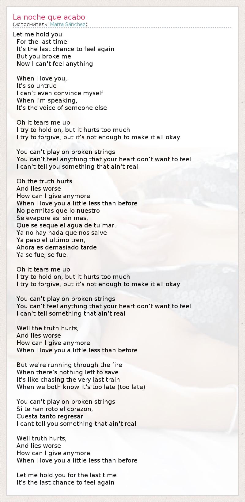 Let me hold you For the last time It's the last chance to feel again But you broke me Now I can't feel anything When I love you, It's so untrue I can't even convince myself When I'm speaking, It's the voice of someone else Oh it tears me up I try to hold on, but it hurts too much I try to forgive, but it's not enough to make it all okay You can't play on broken strings You can't feel anything that your heart don't want to feel I can't tell you something that ain't real Oh the truth hurts And lies worse How can I give anymore When I love you a little less than before No permitas que lo nuestro Se evapore asi sin mas, Que se seque el agua de tu mar. Ya no hay nada que nos salve Ya paso el ultimo tren, Ahora es demasiado tarde Ya se fue, se fue. Oh it tears me up I try to hold on, but it hurts too much I try to forgive, but it's not enough to make it all okay You can't play on broken strings You can't feel anything that your heart don't want to feel I can't tell something that ain't real Well the truth hurts, And lies worse How can I give anymore When I love you a little less than before But we're running through the fire When there's nothing left to save It's like chasing the very last train When we both know it's too late (too late) You can't play on broken strings Si te han roto el corazon, Cuesta tanto regresar I cant tell you something that ain't real Well truth hurts, And lies worse How can I give anymore When I love you a little less than before Let me hold you for the last time It's the last chance to feel again